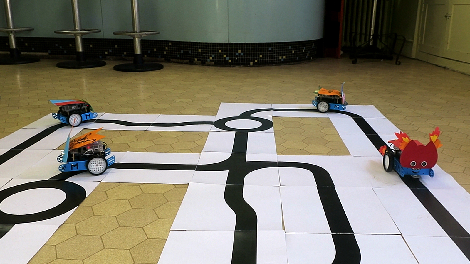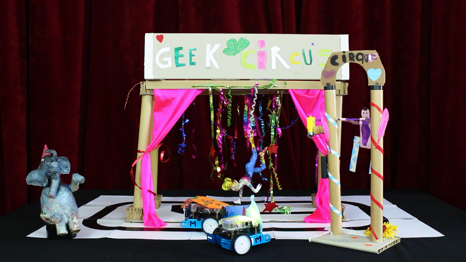Un bref aperçu d’un numéro de cirque tel que nous allons en réaliser, ici avec un robot Mbot programmé pour suivre la piste.